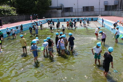 総合的な学習の時間で、冬の間にプールに定着したヤゴの救出を行いました。