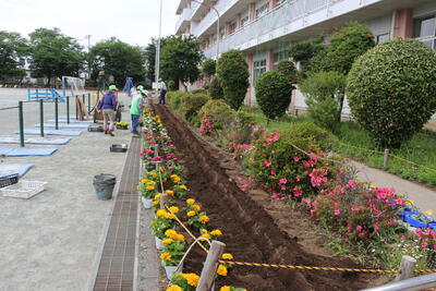 メジャーで丁寧に植える位置を確認したり、花壇全体を掘り起こしたりと、大変労力をかけていただきました。