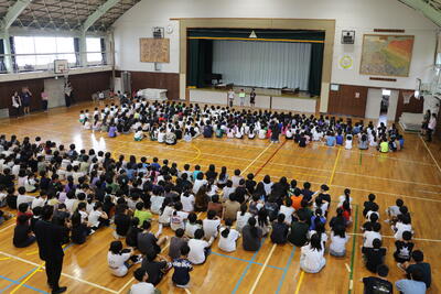 今日の児童朝会は「にこにこ班遊び」の説明でした。児童会から目当てなどの説明がありました。