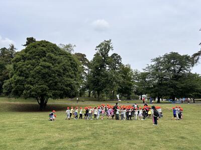 そんな中、全体でじゃんけん列車や猛獣狩りゲームをしたり、自由に走り回ったり、坂道をゴロゴロ転がり落ちたりと楽しい時間を過ごすことができました。