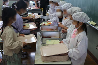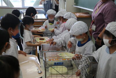 慣れない給食なので4時間目の途中から配膳を始めます。
