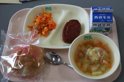 ※写真は職員室用の盛り付けなので、1年生の場合はもっと盛り付けが少なく、パンも小さいです。